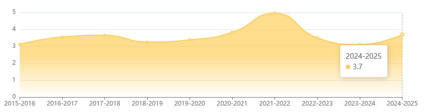 (2) 影响因子:近几年影响因子呈现缓慢下降的趋势,最新为3.7,实时影响因子3.806。