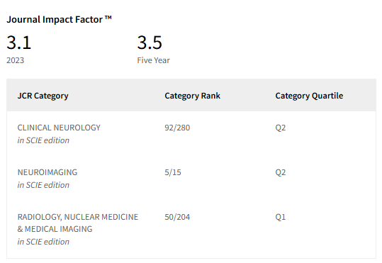 AMERICAN JOURNAL OF NEURORADIOLOGY作为神经成像领域的重要期刊,位于中科院医学2区,其最新影响因子3.7,年发文量稳定,对国人友好,感兴趣的小伙伴可以了解一下。