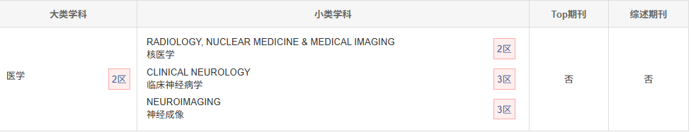 (1) 分区:期刊位于中科院大类-医学2区,在小类-核医学位于2区,临床神经病学,神经成像位于3区。