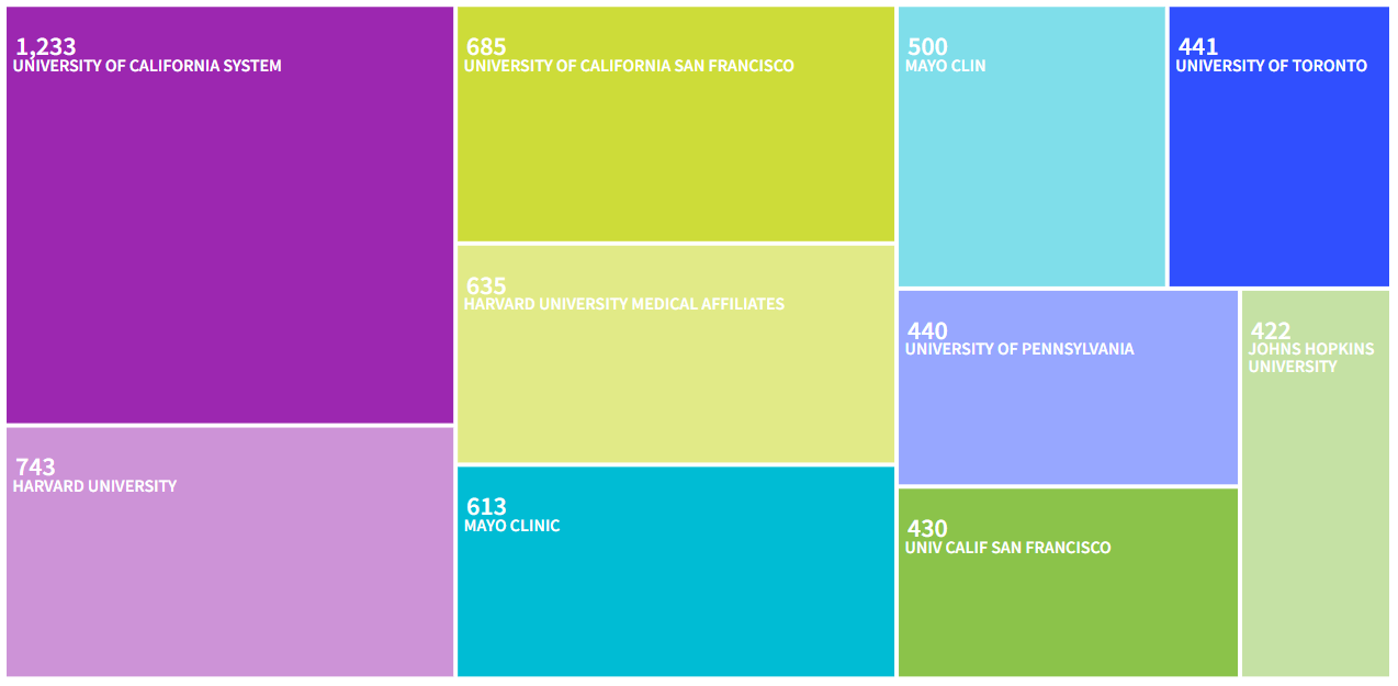 WOS数据显示,发文量前10的机构中,加利福尼亚大学、哈佛大学、加州大学洛杉矶分校排名靠前。