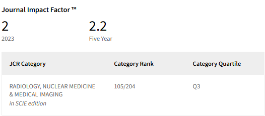 JCR数据显示,小类放射学、核医学与医学影像稳定在Q3区且排名靠前,属于高质量期刊。