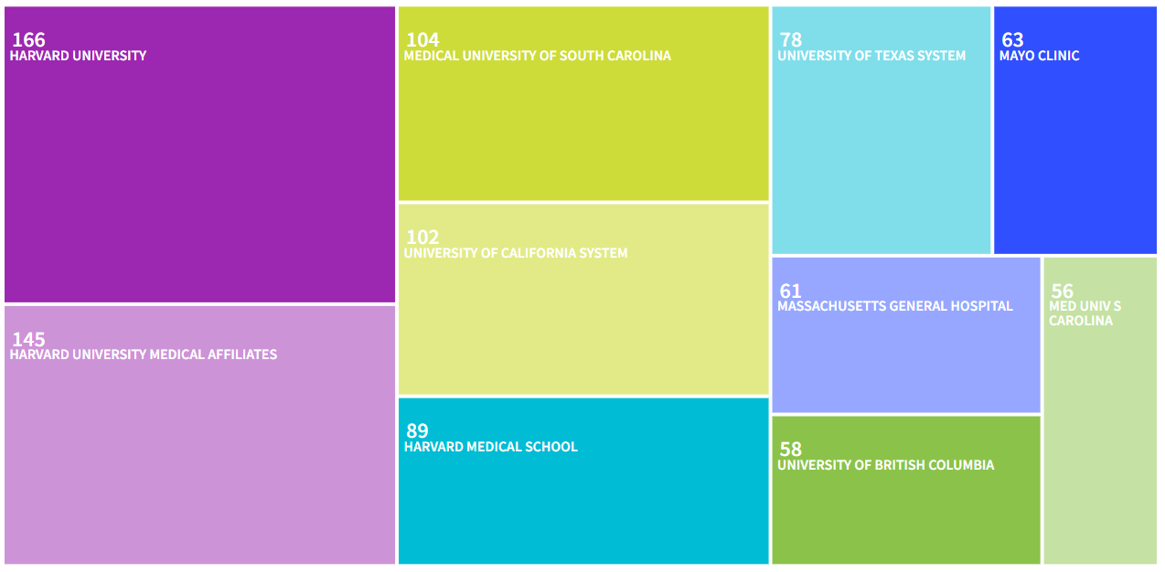 WOS数据显示,发文量前10的机构中,哈佛大学、南卡罗来纳医科大学、加利福尼亚大学排名靠前。