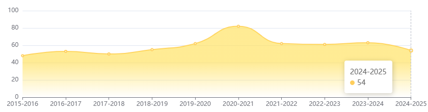 期刊年发文量自2020年下降后呈现平稳的趋势,2024-2025年为54篇,文章质量高。